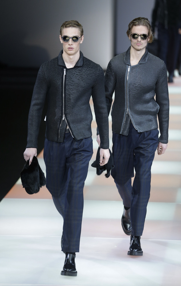 Models wear creations for Emporio Armani men's Fall-Winter 2015-2016 collection, part of the Milan Fashion Week, unveiled in Milan, Italy, Monday, Jan. 19, 2015. (AP Photo/Luca Bruno)