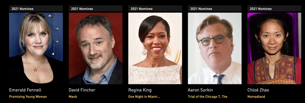 A su vez, como mejor Director aparecen Emerald Fennell (Promising Young Woman), David Fincher (Mank) Regina King (One Night in Miami), Aaron Sorkin (The Trial of the Chicago 7) y Chloé Zhao (Nomadland).