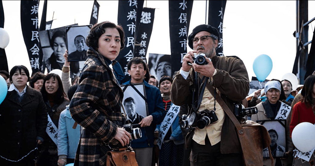 ‘El fotógrafo de Minamata’ recrea el viaje a Japón, que Smith efectuó en 1971. La activista Aileen Mioko quien luego sería su esposa y describe en su libro la narrativa del film, viajó a Nueva York en 1971 en búsqueda del prestigioso fotógrafo Eugene Smith un glorioso y célebre fotógrafo que gráfico las instantáneas en tiempos de la II Guerra Mundial, siendo la figura más importante de la revista ‘LIFE’ la revista solía tener en aquel entonces siete millones de ejemplares de tirada en su momento de mayor auge, una de las más importantes en el fotoperiodismo mundial, allí se publicó Death-Flow From a Pipe (“La muerte que fluye de una tubería”, número del 2 de junio de 1972), sobre la enfermedad de Minamata. Luego vendría en 1975 la publicación del álbum de fotografías Minamata; Words and Photographs (“Minamata; palabras y fotografías”; W.E. Smith y A. M. Smith), que dio a conocer internacionalmente la enfermedad.